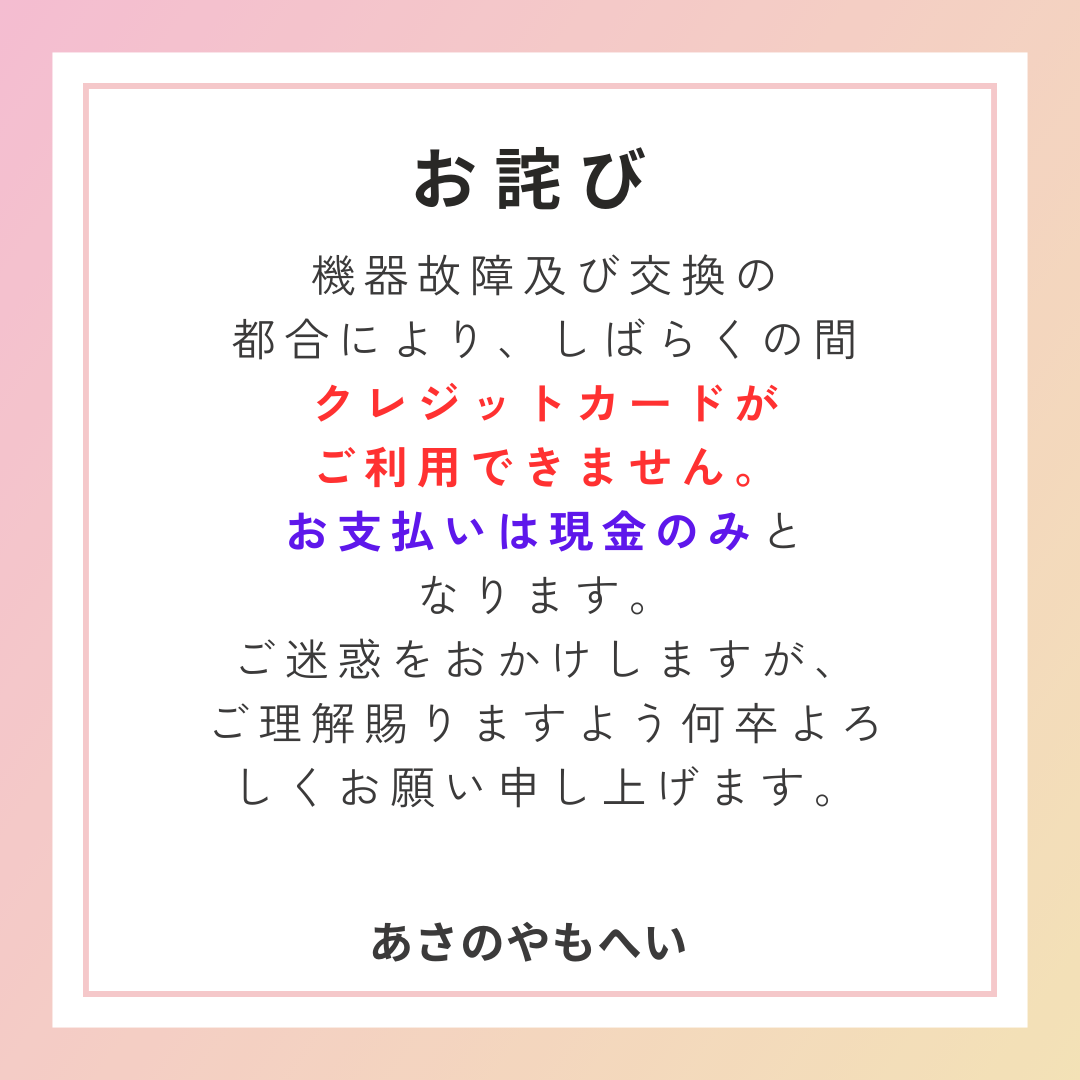 現金払いのみとなりますこと、お詫び申し上げます。
