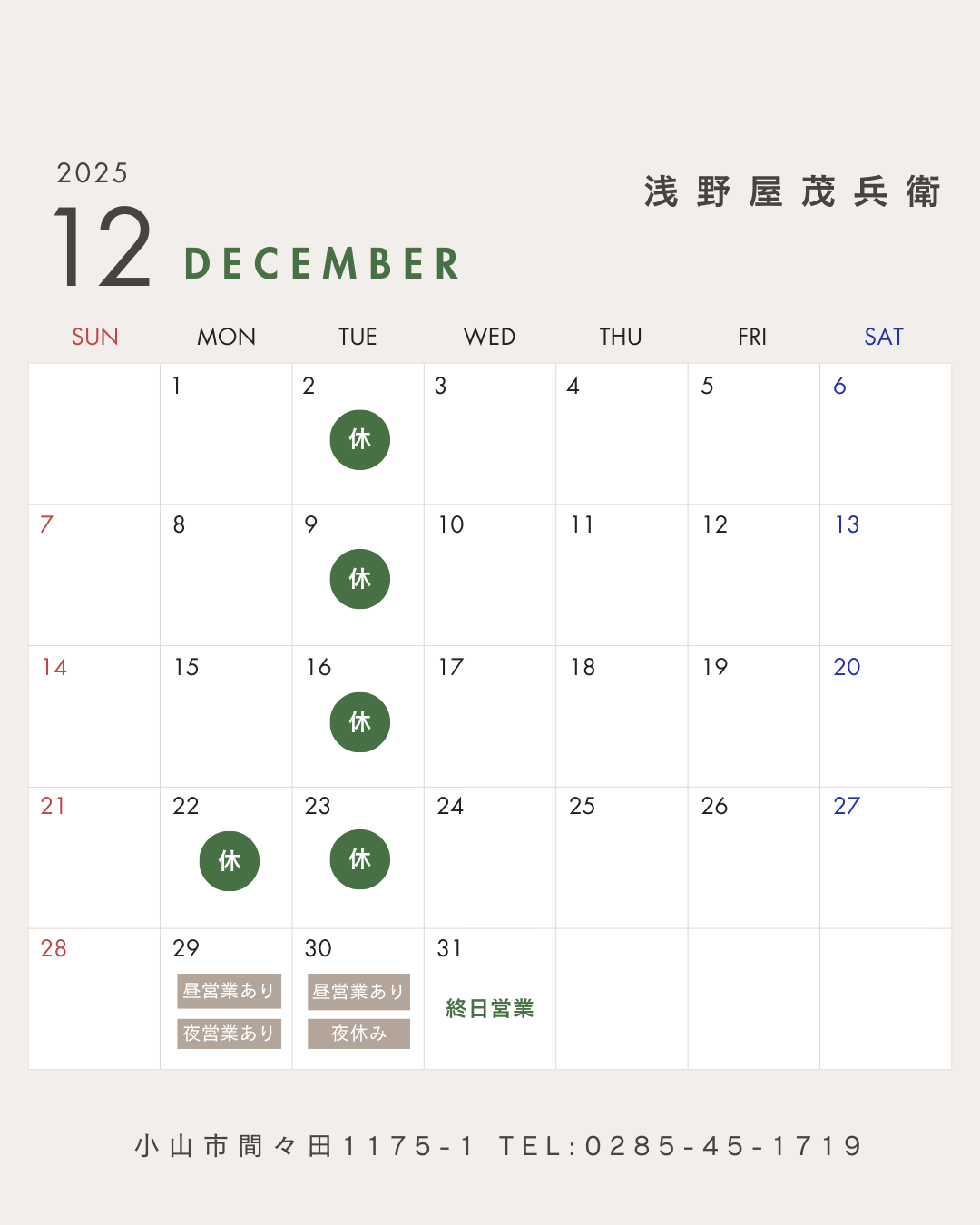 平素よりご愛顧いただきありがとうございます。 12月のお休みをお知らせします。 12月2日(火)・9日(火) 16日(月)・22日(月)・23日(火) *連休 22日(月)・23日(火) 12月の連休は都合により第4週の月火となります。 *29日(月)は昼夜営業いたします。 30日(火)は昼のみ営業、 夜は年越しそばの準備のため お休みとさせていただきます。 どうぞよろしくお願いいたします。