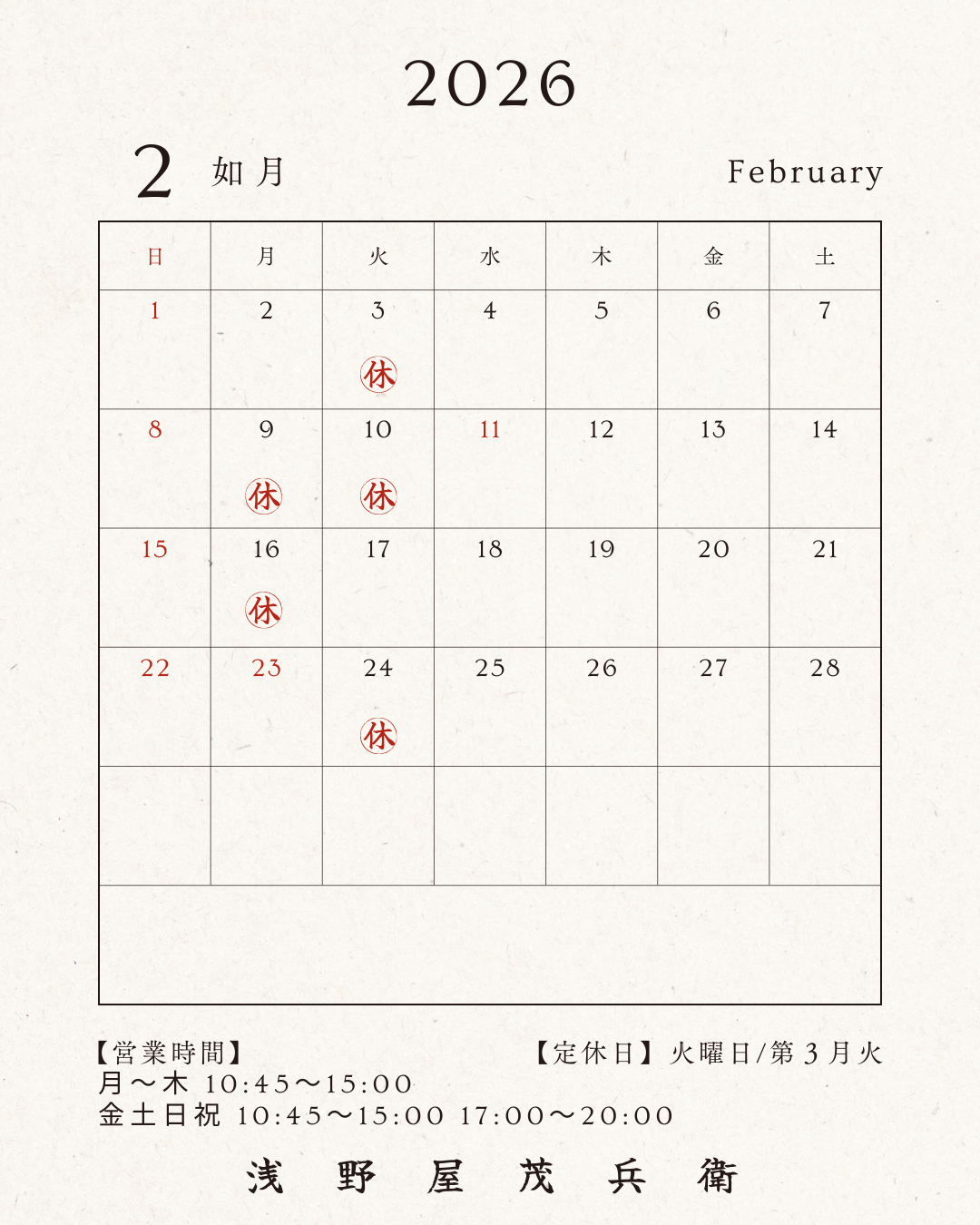 【2月のお休み】 平素よりご愛顧いただきありがとうございます。 今月は都合により連休が第2週の月火となります。 またご予約の関係で第3週の火曜日は営業、 振替で月曜日がお休みとなります。 お客様におかれましては、ご確認の上 ご来店いただけますようお願いいたします。 2月3日(火)・9日(月)・10日(火) 16日(月)・24日(火) どうぞよろしくお願いいたします。 浅野屋茂兵衛